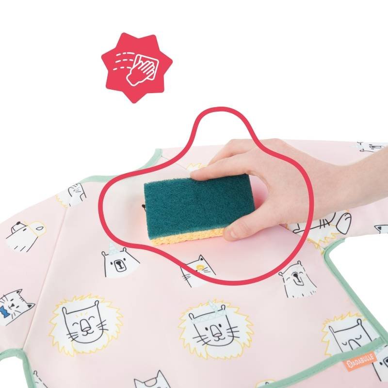 L’enfant pourra manger proprement sans se salir grâce aux manches longues élastiques aux poignées. Au centre, une grande poche permet de retenir les aliments qui se sont échappés de l’assiette. Le bavoir de Badabulle est facile à nettoyer, à la main ou en machine.