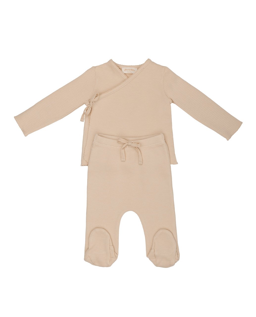 Ensemble pour nouveau-né, 100 % coton biologique certifié. Fermeture portefeuille avec lien et pantalon à pieds. Doux, confortable et idéal pour les premiers mois.
