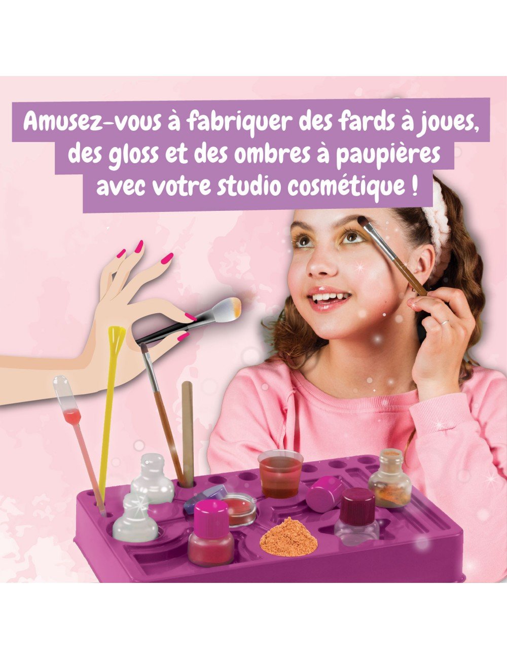Avec ce fantastique jouet, tu peux apprendre à fabriquer tes propres fards à joues, rouges à lèvres, gloss et ombres à paupières ! Découvre les 3 activités que te réserve ce jouet et amuse-toi à personnaliser tes propres produits de maquillage !